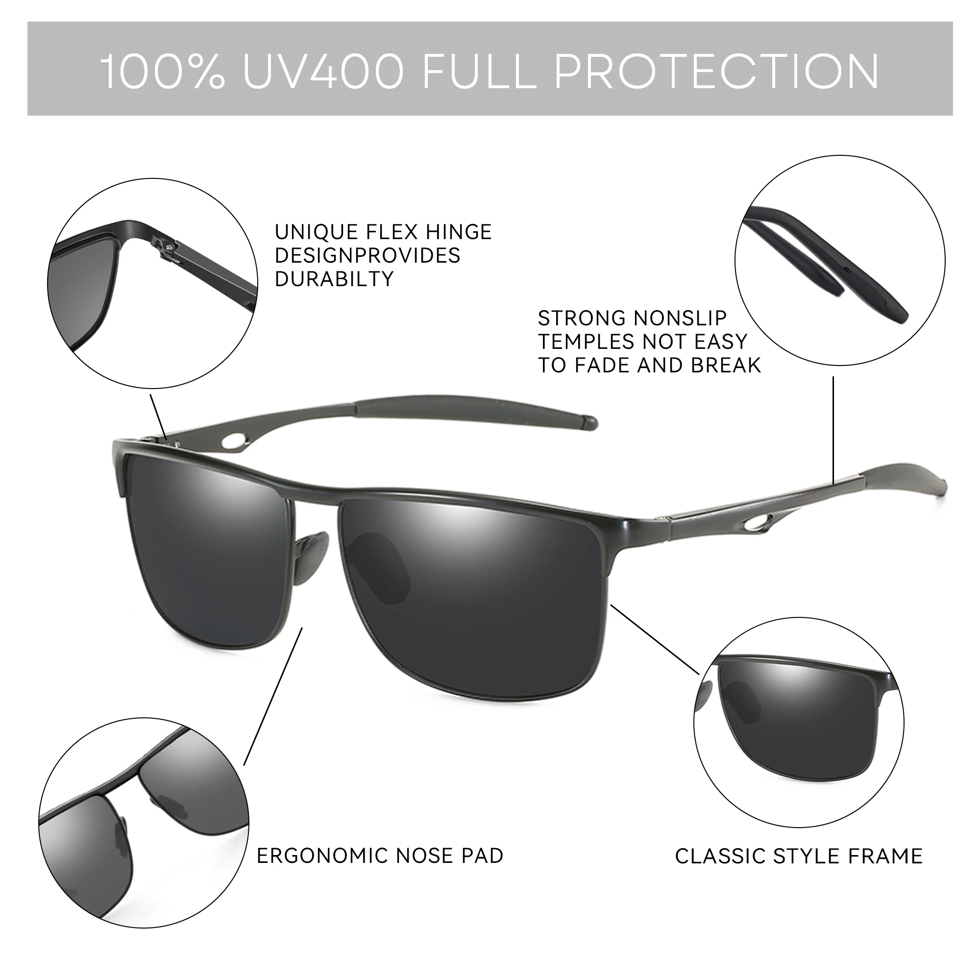 הגנת UV400 מלאה: חסימה של 100% מקרני ה-UVA וה-UVB המזיקות לשמירה על בריאות העין בשמש חזקה.