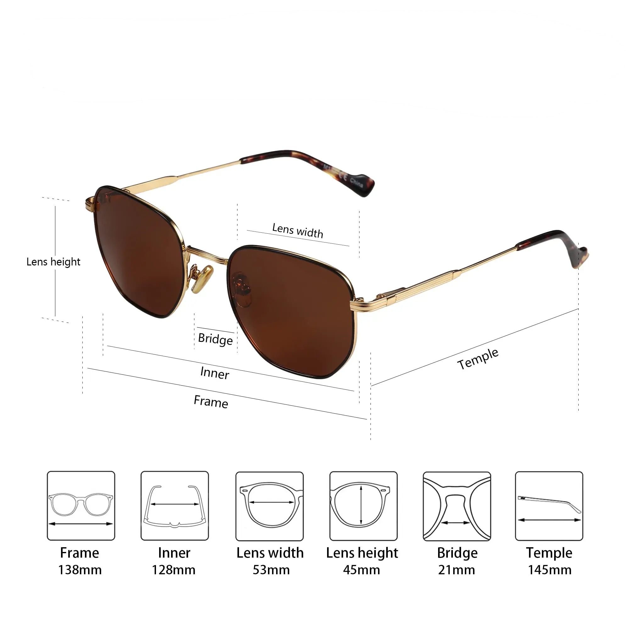 VISU Hexagon Retro Edition דגם המשושים של VISU משלב מסגרת מתכת קלאסית עם נגיעות מודרניות. העדשות המקוטבות (Polarized) מבטלות סנוור ומספקות הגנה מקסימלית מהשמש, בעוד המבנה הקליל מבטיח נוחות לאורך כל היום.